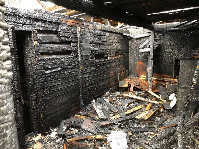 10 кв. м кровли дома и имущество в доме, закопчены стены и потолок.
