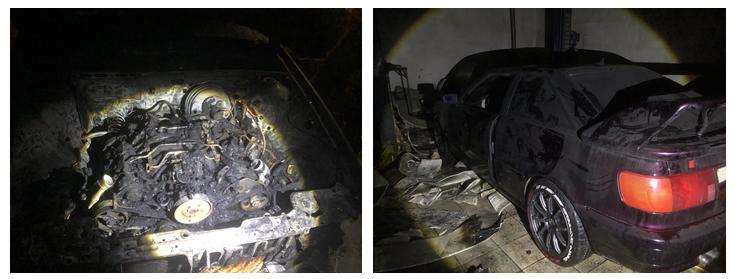 В результате пожара поврежден моторный отсек автомобиля, пластиковая отделка потолка гаража на площади 60 м.кв.