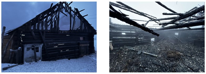 В результате пожара закопчены стены и потолок подсобного помещения МТФ 5х8 м, повреждено 2 кв.м. деревянной обшивки железобетонного перекрытия подсобного помещения.