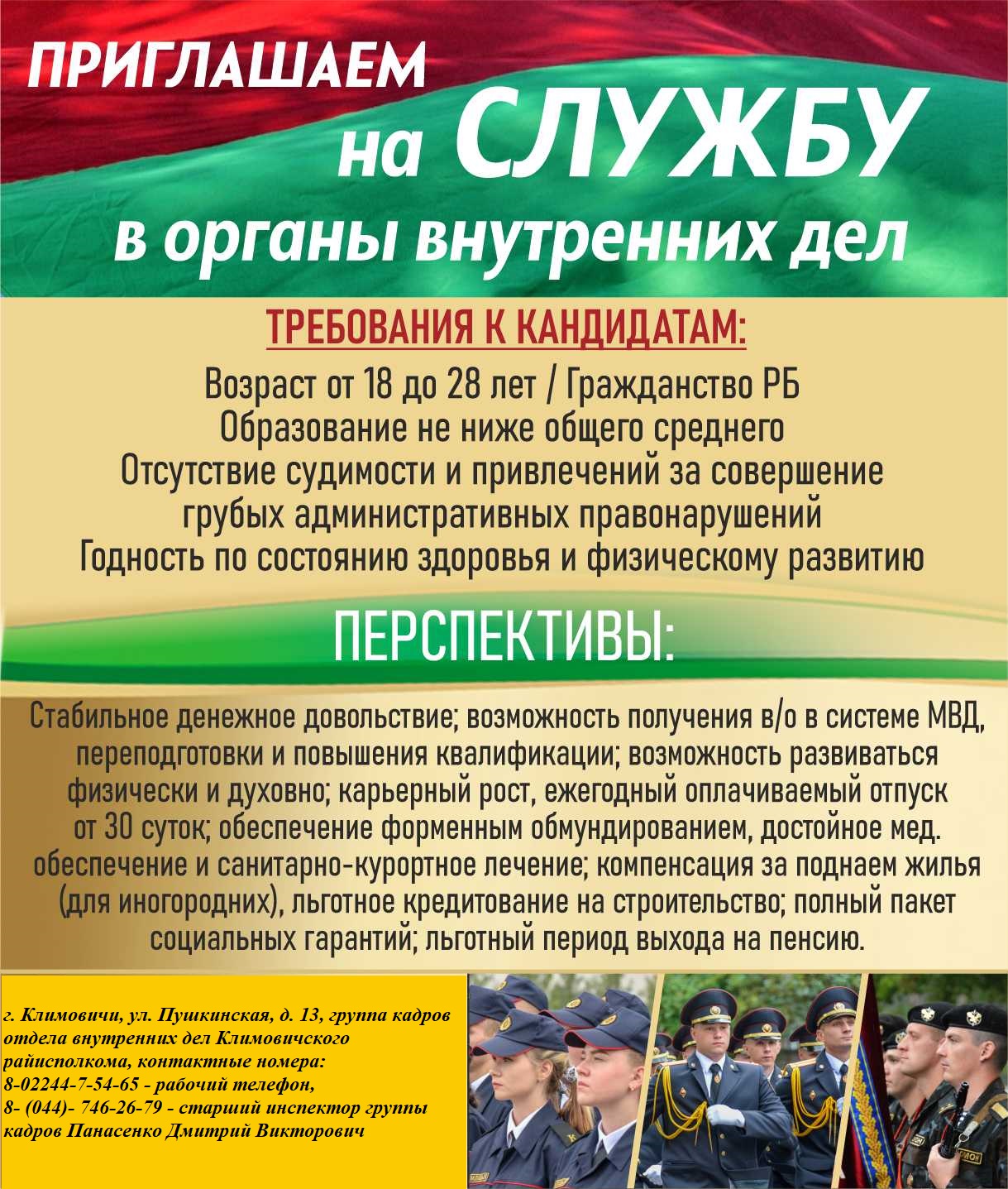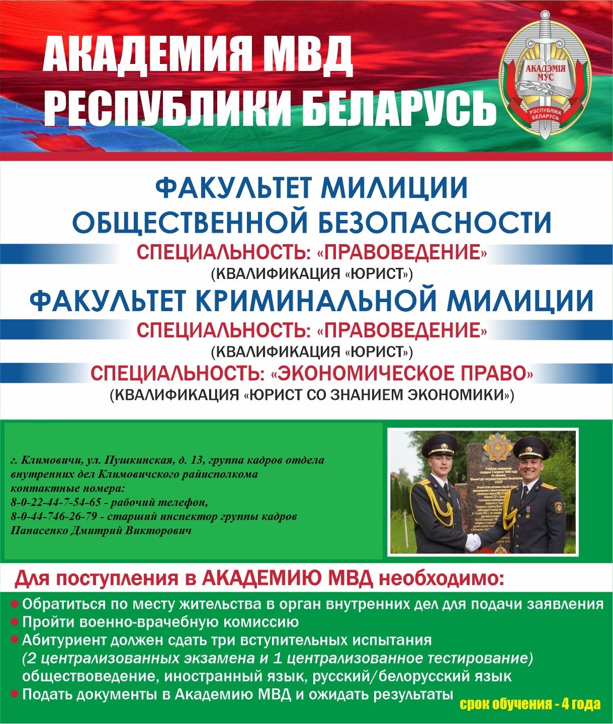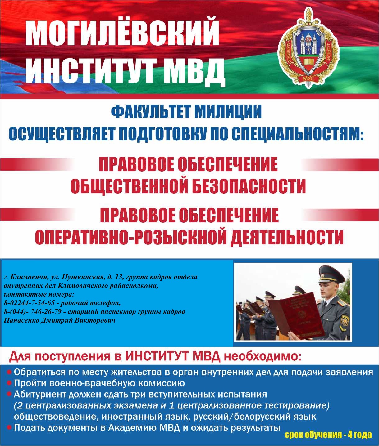 Более подробную информацию о порядке поступления и учёбы можно получить на сайтах учреждений образования МВД и в группе кадров Климовичского РОВД (телефон 75-465, 75-448).