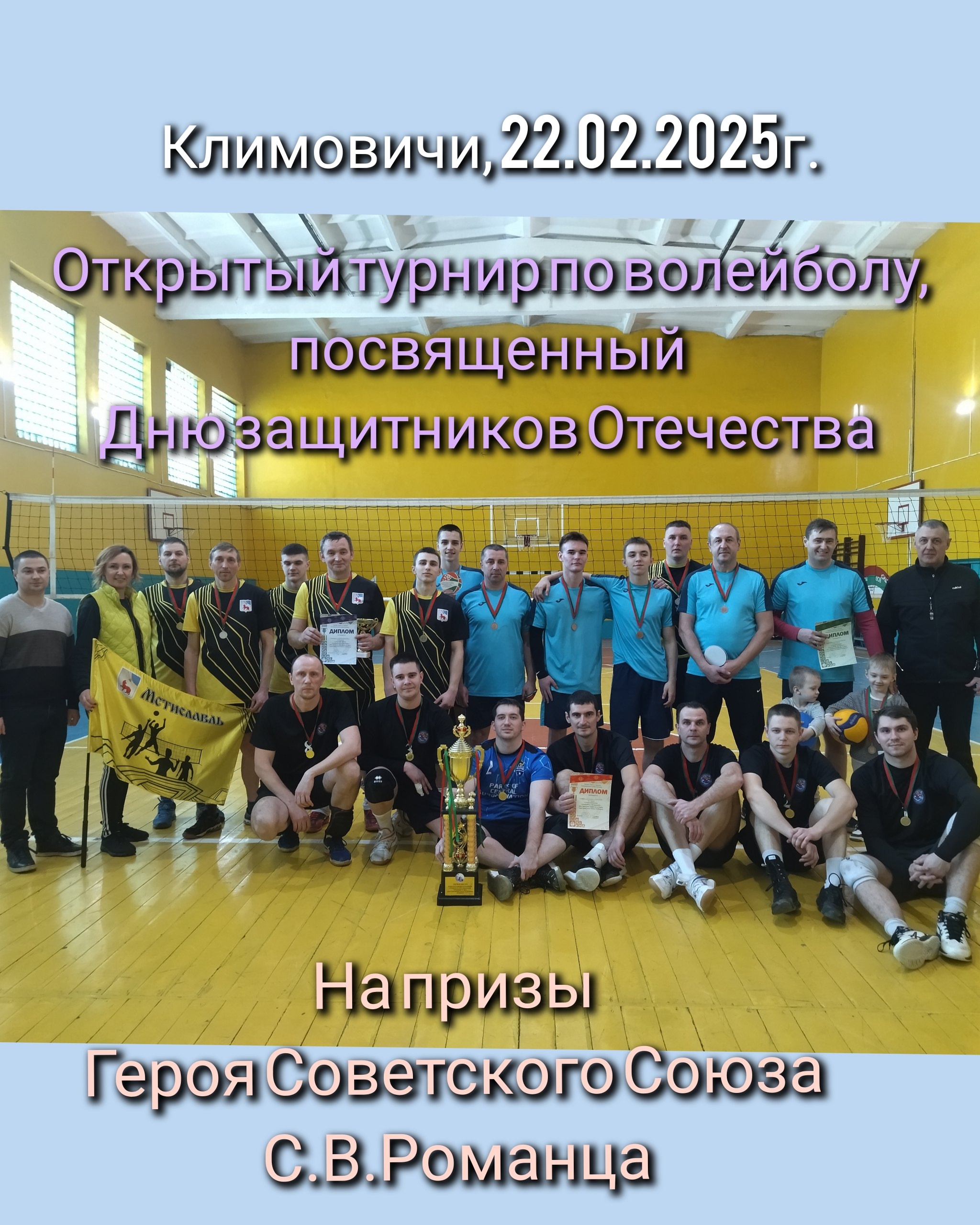 22 февраля 2025 года в г. Климовичи состоялся открытый турнир по волейболу, посвященный Дню защитников Отечества, на призы Героя Советского Союза С.В.Романца. Приняло участие 6 команд: г.Могилев, г.Кричев, г.Мстиславль, г.п.Кпаснополье, г.Климовичи -1, г.Климовичи - 2. Разыгрывался переходящий кубок.